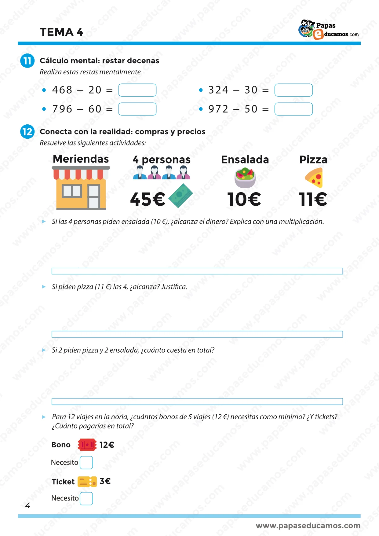 Incluye ejercicios con capicúas de tres cifras, el uso de números ordinales (del 1.º al 20.º) y el cálculo mental con sumas de decenas. Se refuerzan las operaciones en vertical (suma y resta) y la resolución de problemas con situaciones cotidianas, como compras en una tienda o contar alumnos en clase.