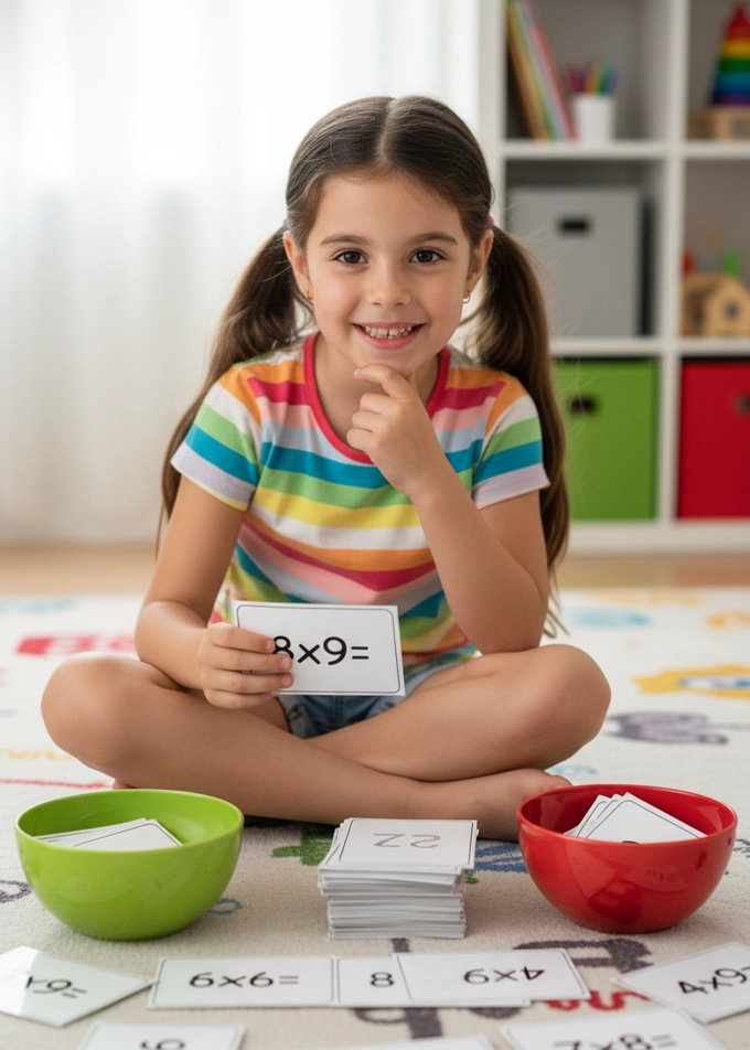 El funcionamiento es muy sencillo: el niño coge una tarjeta, dice el resultado y la gira. Si acierta, va al cuenco verde; si falla, al rojo. Una vez termina, repasa únicamente las tarjetas del cuenco rojo hasta dominarlas. Por tanto, es un recurso rápido, práctico y perfecto para ganar seguridad en las tablas.