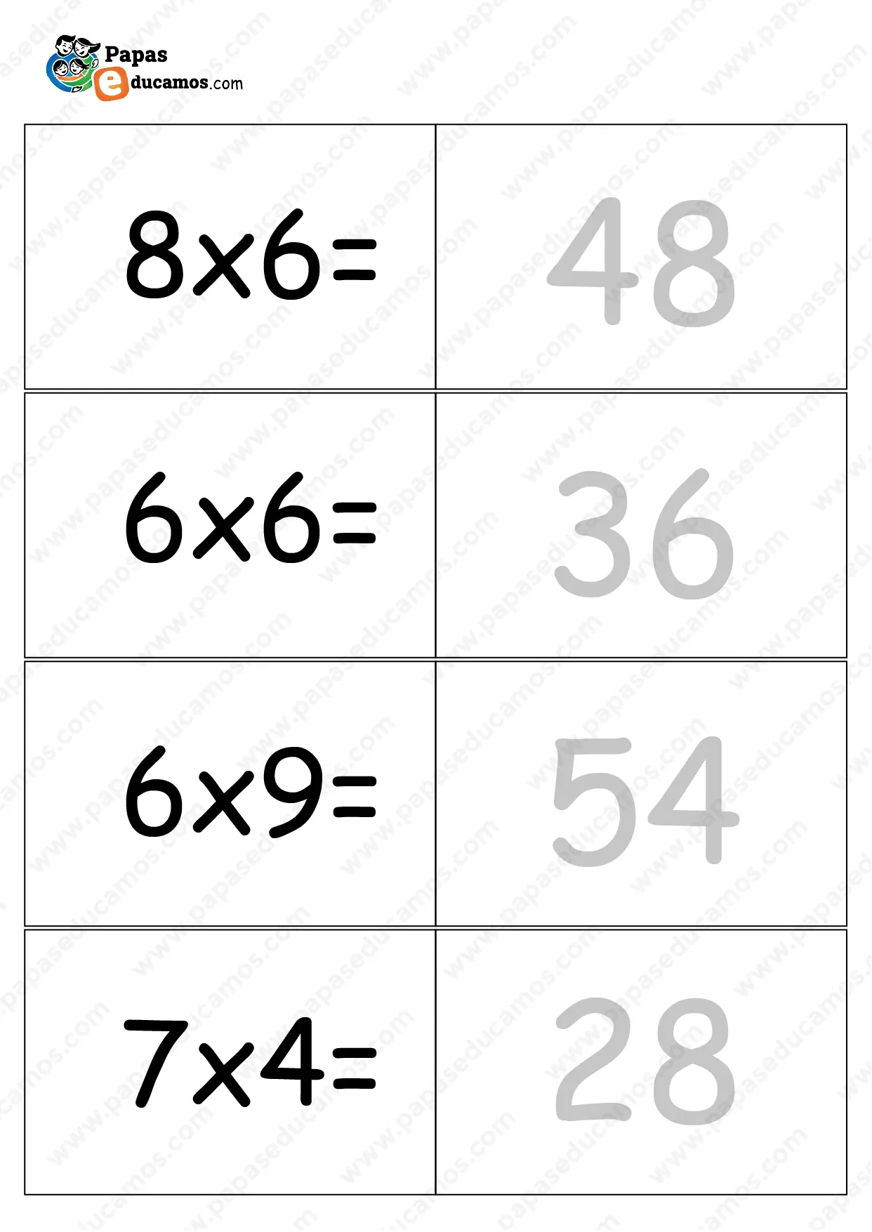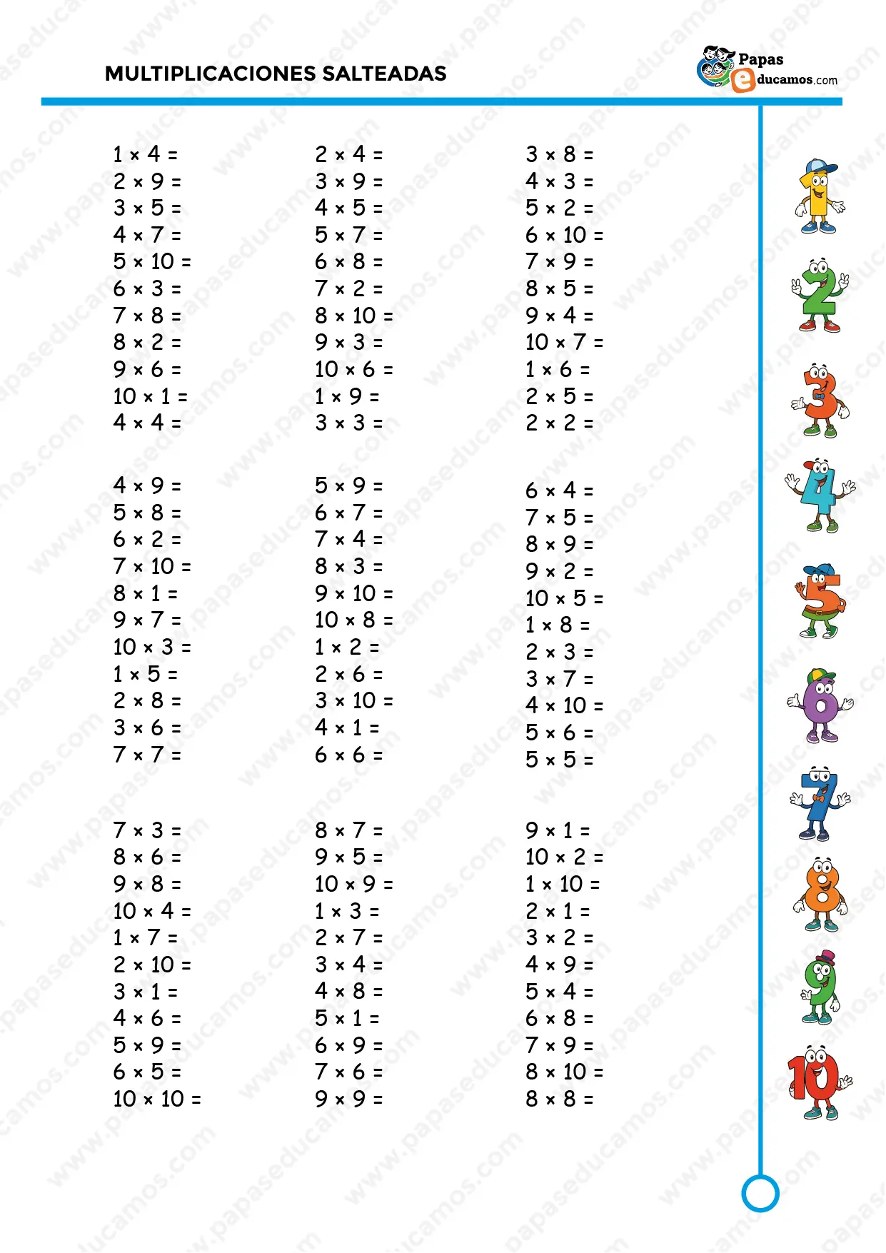 En la primera ficha, los alumnos encuentran todas las multiplicaciones del 1 al 10 mezcladas de manera aleatoria, ideales para comprobar el dominio real de las tablas sin seguir un orden predecible.