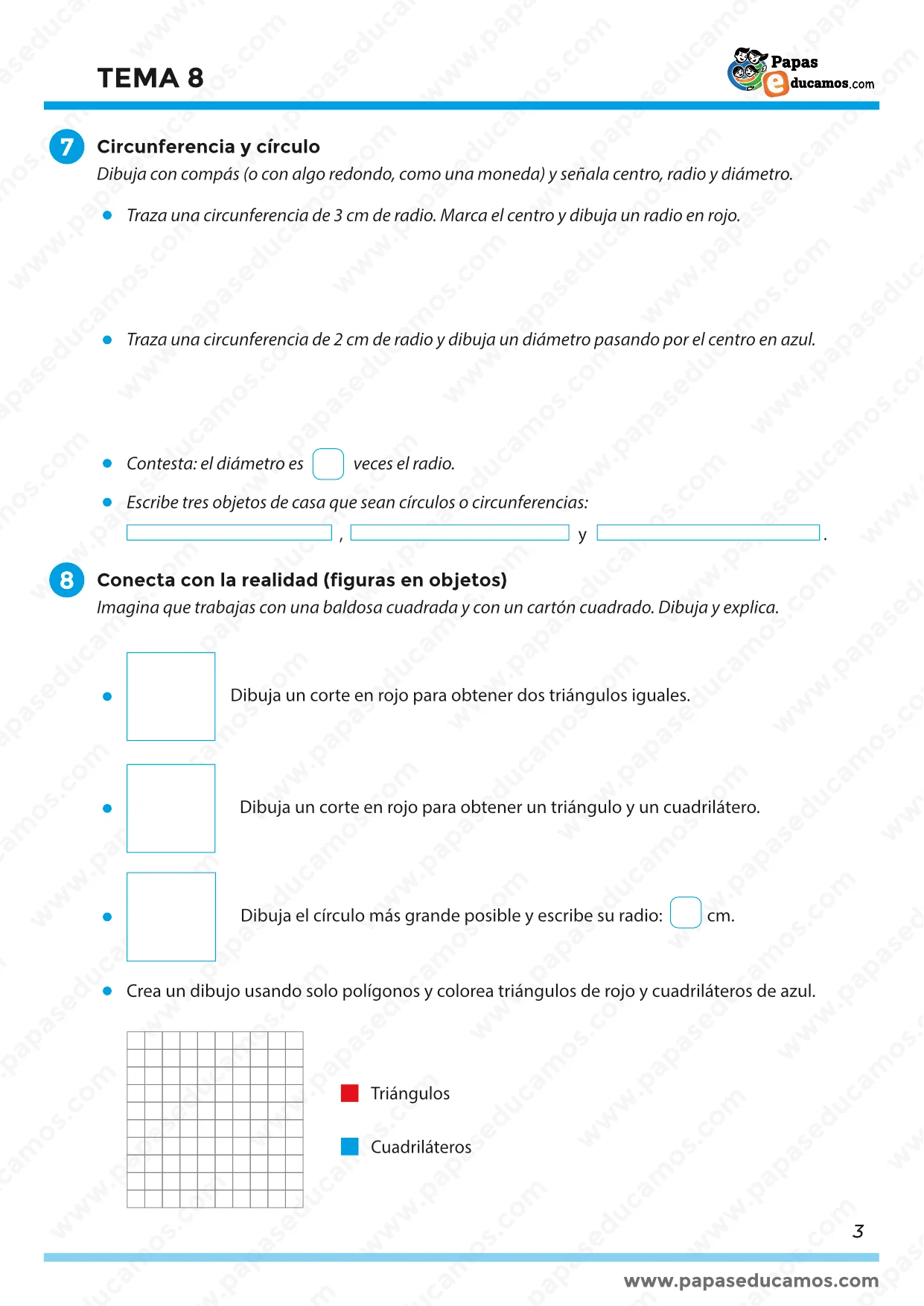 Por otro lado, el tema aterriza estos contenidos en tareas prácticas: calcular el perímetro sumando todos los lados, entender el área contando cuadraditos (cuadrado-unidad) y reconocer circunferencia y círculo señalando centro, radio y diámetro, recordando que el diámetro es el doble del radio. Además, se propone “conectar con la realidad” usando cortes en cuadrados y dibujos con polígonos, lo cual viene genial cuando en casa hay poco tiempo y se necesita que el niño o la niña vea el sentido de lo que hace. Por último, se refuerza el cálculo mental con multiplicaciones y divisiones por 10, 100 y 1.000, aprendiendo a “poner o quitar ceros” para ganar rapidez y seguridad.