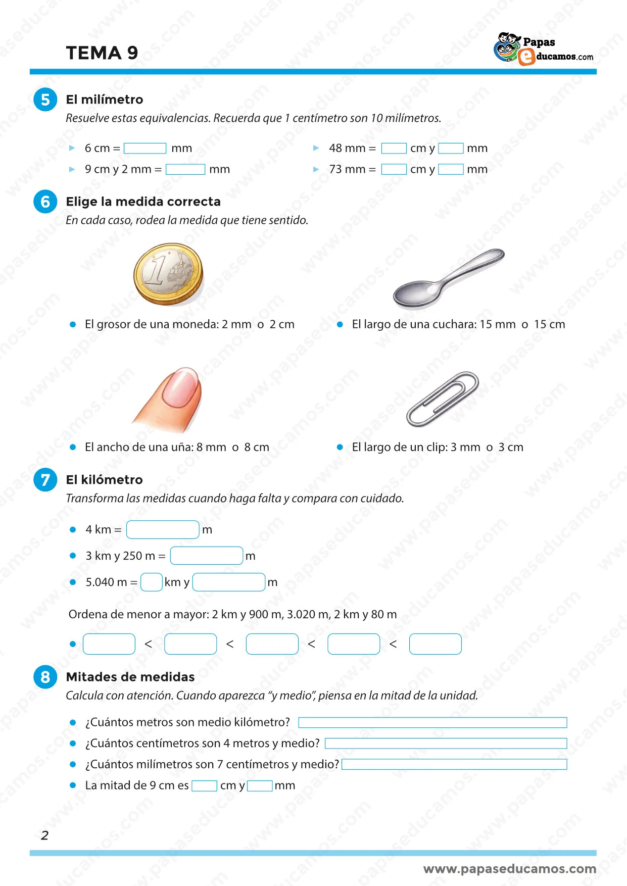 Más adelante aparece el kilómetro, con transformaciones a metros, medidas mixtas (km y m) y ordenación de longitudes de menor a mayor. También se practican las mitades de medidas (“y medio”), que suele ser un punto de confusión típico si no se entrena con calma.