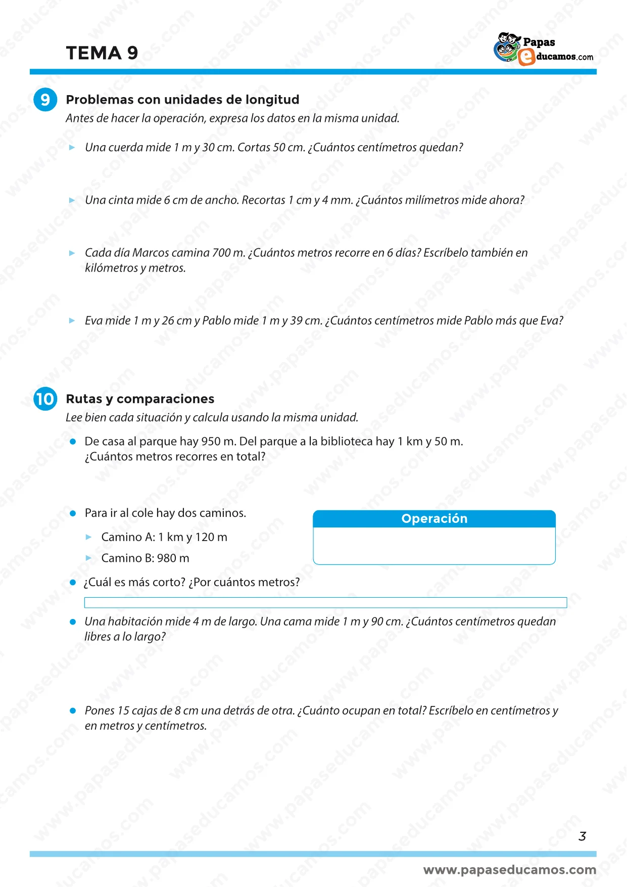 Finalmente, el tema da el salto a problemas con unidades de longitud, donde lo importante es poner todos los datos en la misma unidad antes de operar, y a situaciones de rutas y comparaciones. Se cierra con un bloque muy interesante: “¿Qué hay que calcular?”, para aprender a identificar la pregunta correcta del problema sin necesidad de resolverlo, evitando errores por precipitación.